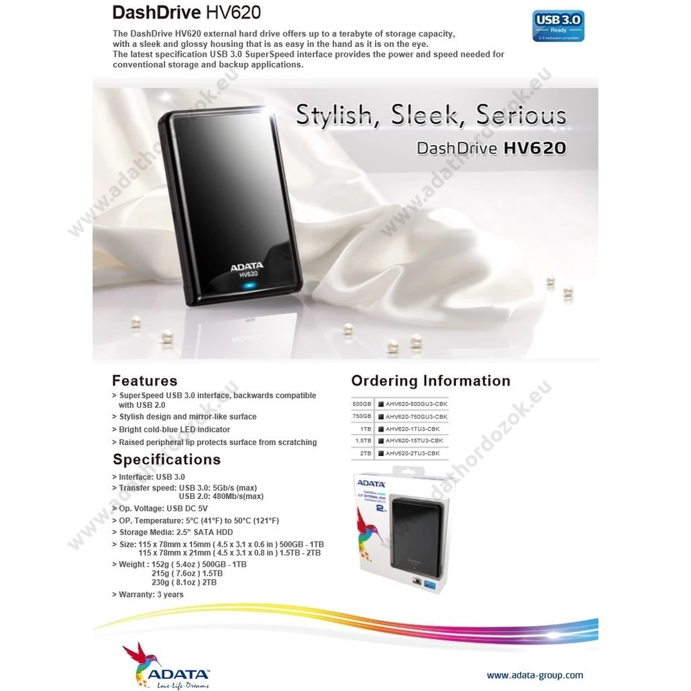 Az Adata DashDrive HV620 USB 3.0 külső merevlemez megjelenésével modern eleganciát sugároz. Esztétikus külsejével, fényes és sima felületével nagyszerű kiegészítője lehet mindennapjainak akár otthonában, akár irodai környezetben. A prémium alapanyagokból készült, kompakt és gyors adathordozó támogatja a „SuperSpeed” USB 3.0 szabványt, ezért adatátviteli sebessége többszöröse az USB 2.0 eszközökhöz képest. A fényes felületet egy alig észrevehető vékony szilikonperem védi meg a mindennapos használatból eredő karcoktól. A merevlemez működését LED folyamatjelző segítségével követheti nyomon. A nagy kapacitású merevlemez segítségével egyszerűen tárolhatja, szállíthatja és megoszthatja filmjeit, zenéit, digitális fényképeket és dokumentumokat. A csomag tartalma 1db 1TB kapacitású fekete színű Adata Dashdrive HV620 külső merevlemez és 1db USB 3.1/USB3.0/USB2.0 adatkábel.
