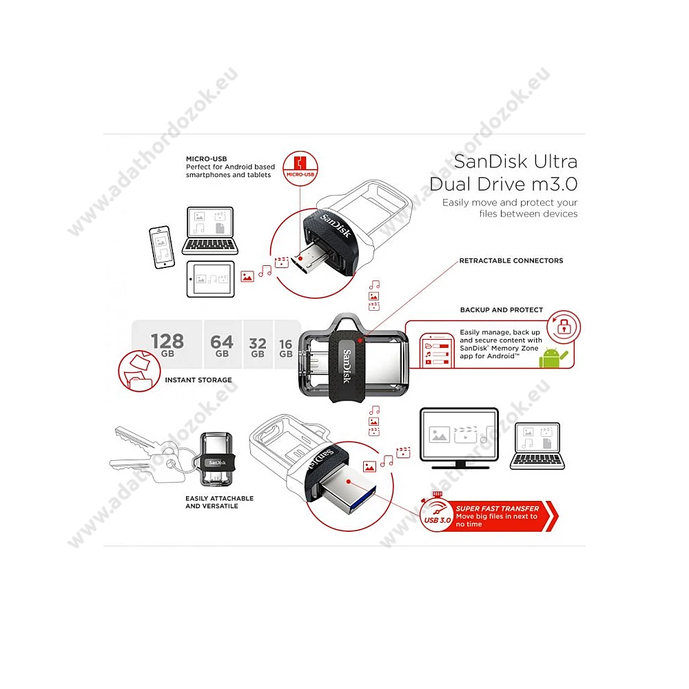 A kompakt méretű Sandisk UltraDual Drive M3.0 OTG USB 3.0 OTG-képes pendrive ideális választás digitálisan tárolt adatok gyors mentéséhez, tárolásához, szállításához és megosztásához. Az adathordozó két végén kialakításra került egy normál USB és egy microUSB csatlakozó is. Kompatibilis androidos okostelefonokhoz és táblagépekhez ideális választás, mivel tökéletesen alkalmas számítógép használata nélküli adatmentésre vagy memóriabővítésre. Zárókupak nélküli kialakítású, visszahúzható csatlakozós adathordozó. Támogatja a nagysebességű „SuperSpeed” USB 3.0 szabványt, ezért használatával időt takarít meg. Visszafelé kompatibilis eszköz, USB 2.0 porton is hibamentesen működik. Jól megfogható elegáns flash drive, melyet a kialakított nyíláson keresztül kulcstartóra fűzve is magával vihet. Kompatibilis a jelenleg használt operációs rendszerekkel. A csomag 1db 32GB kapacitású Sandisk UltraDual Drive M3.0 OTG USB 3.0 OTG-képes pendrive-ot tartalmaz áttetsző házban.
